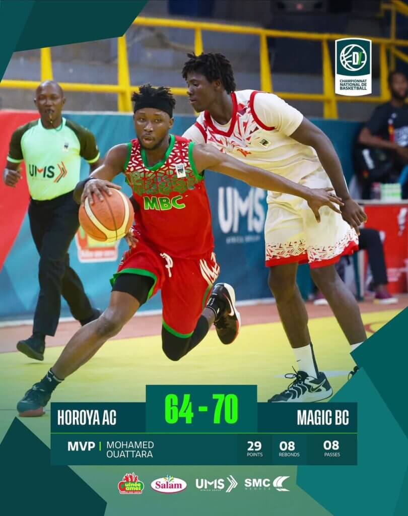 Le Horoya AC, fort de deux victoires consécutives, a vu sa série s’arrêter brutalement face au Magic Basket-ball Club (MBC), qui s’est imposé avec autorité sur le score de 70 à 64. Ce revers marque un coup d’arrêt pour le club de Conakry, qui semblait pourtant en pleine confiance en championnat.